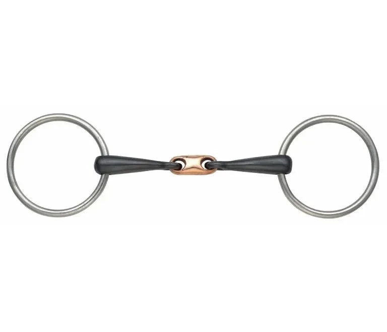 With a sweet iron mouthpiece designed to produce a sweet taste and encourage salivation as it oxidizes. The copper lozenge and loose ring cheeks make this a relatively mild training bit.