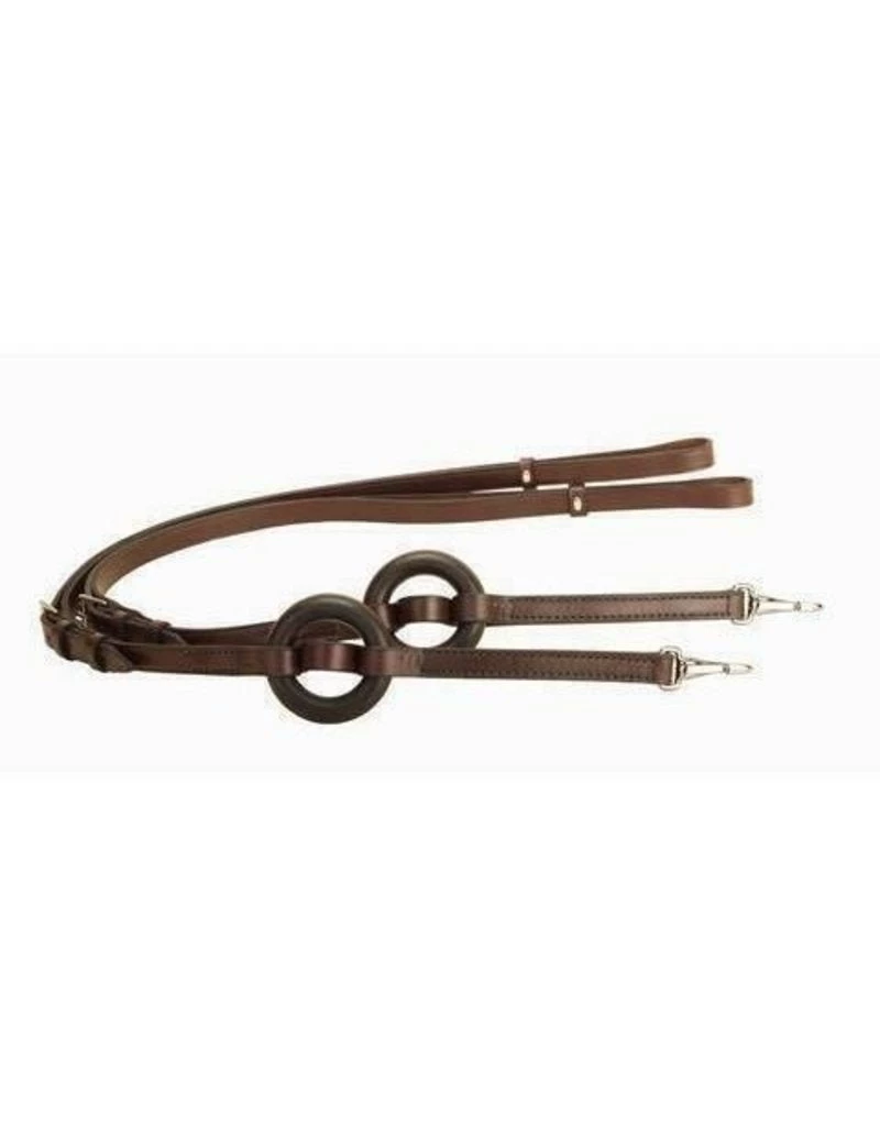 Tory Leather Donut Side Reins Bridle leather side reins with rubber donut, that allows some flexibility while lunging. These reins are great for teaching your horse the right posture for when you are riding. Thick rubber donut allows a limited amount of give. Buckle adjusts to fit a wide range of sizes. Made in USA.
