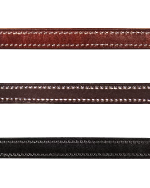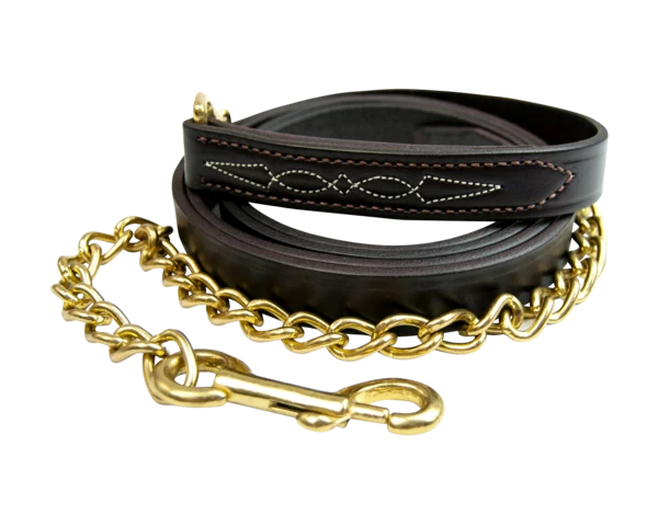 This lead is 6′ long and 1″ wide with a 30″ solid brass chain (Stainless Steel chain for black leather). Beautiful white fancy stitching and stamped edging make it a stand out lead!